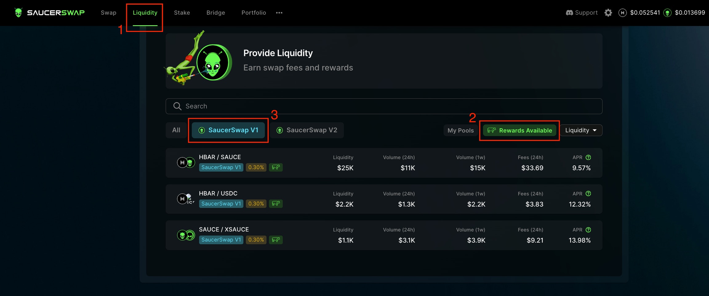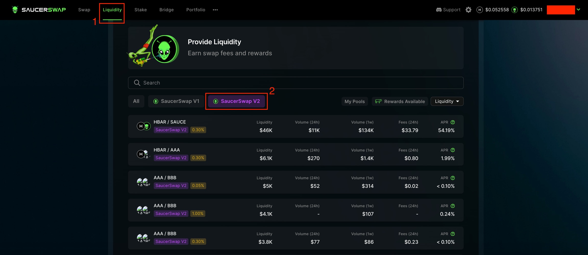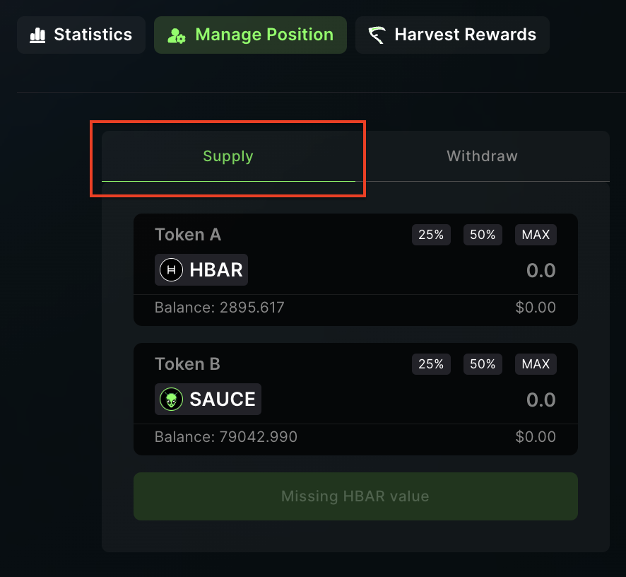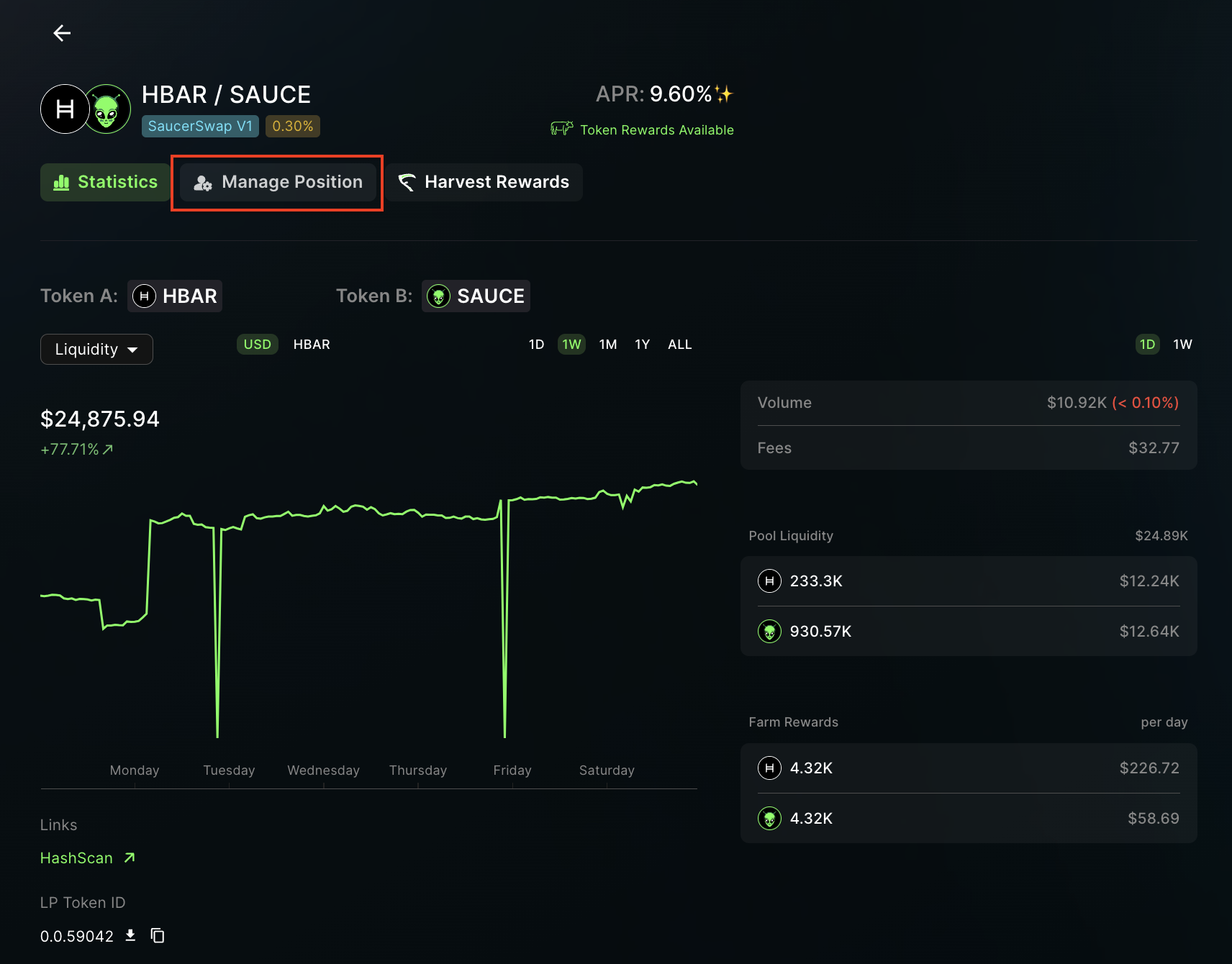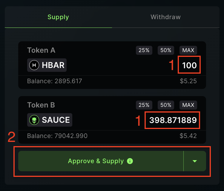 - Ensure you have sufficient HBAR for network fees and tokens for liquidity provision.