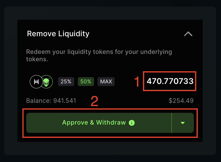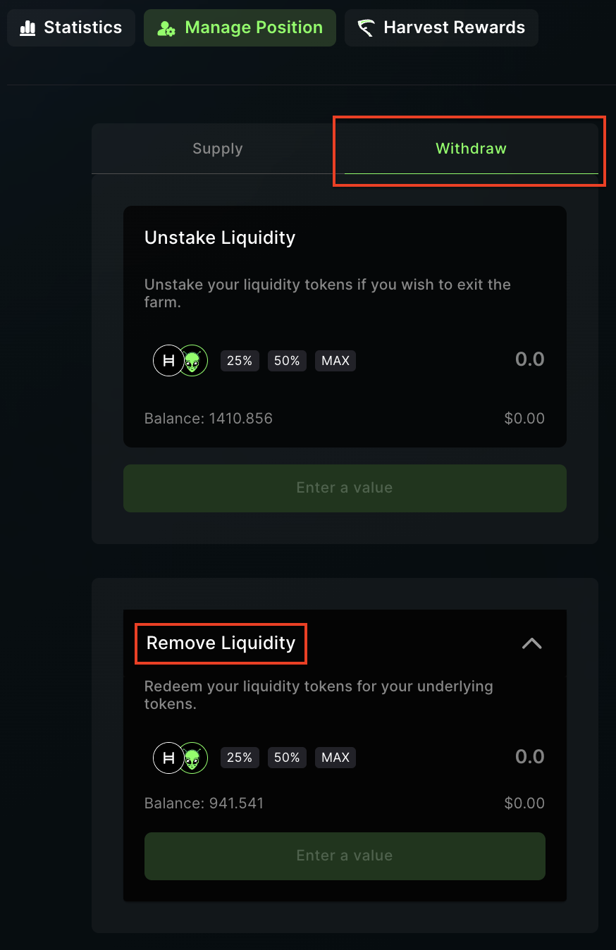 1. Navigate Interface- Inside the “Manage Position” tab, select “Withdraw,” and locate the “Remove Liquidity” section.