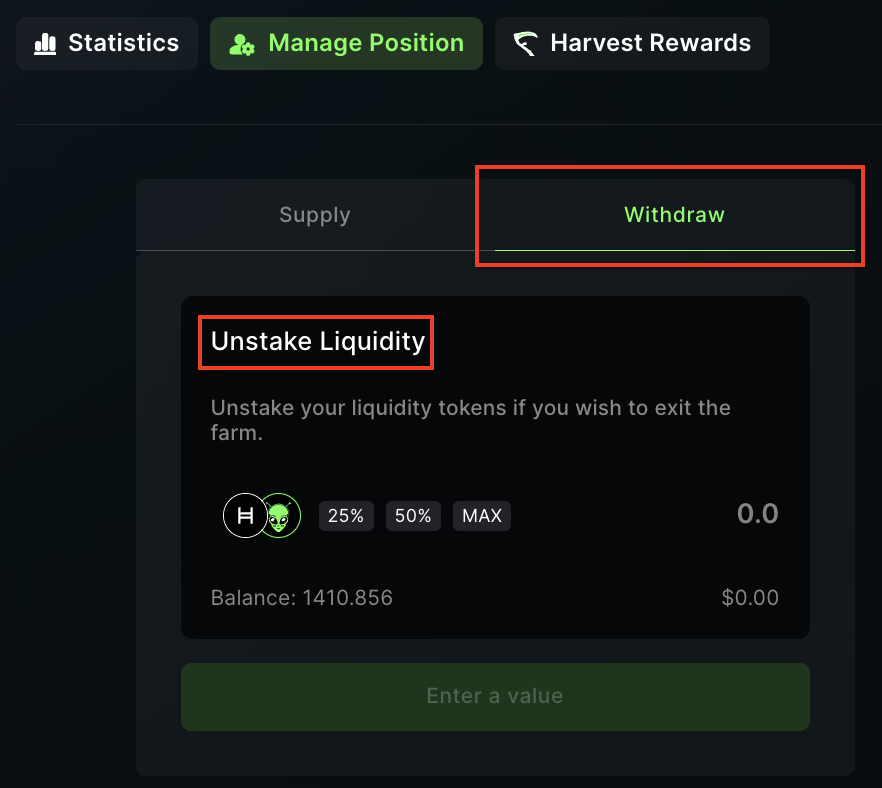 1. Navigate Interface- Inside the “Manage Position” tab, select “Withdraw” and locate the “Unstake Liquidity” section.