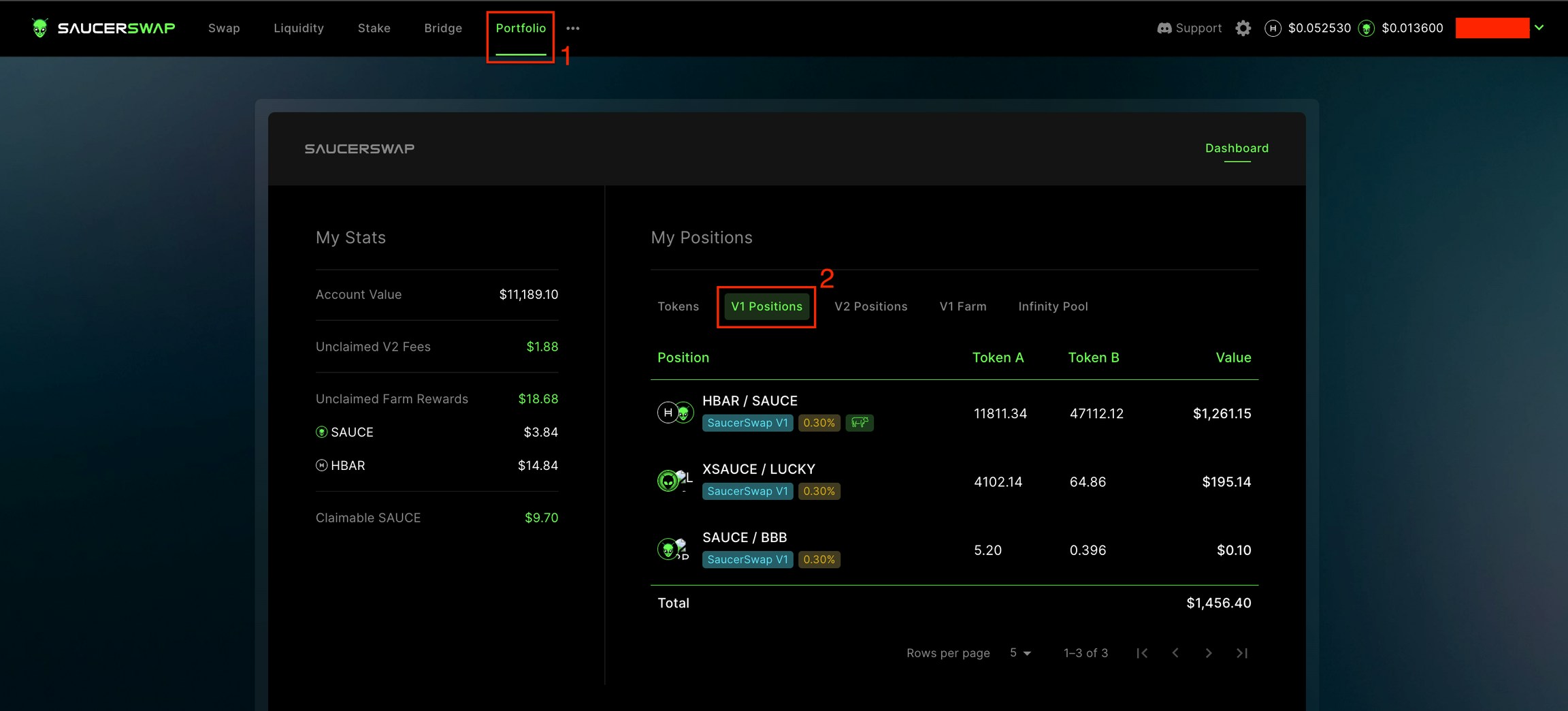 - Existing farm positions are accessible via either the “V1 Farm” tab of the “Portfolio” page or directly from the “Liquidity” page.