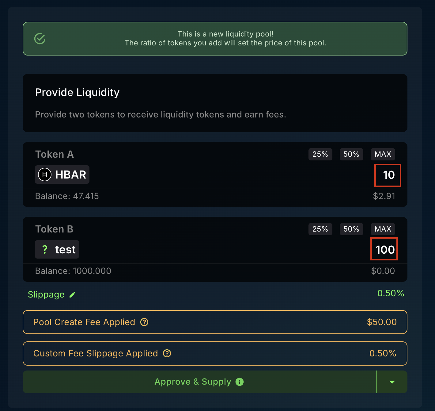 - Be aware that creating a pool incurs a $50 fee in HBAR as a security measure.