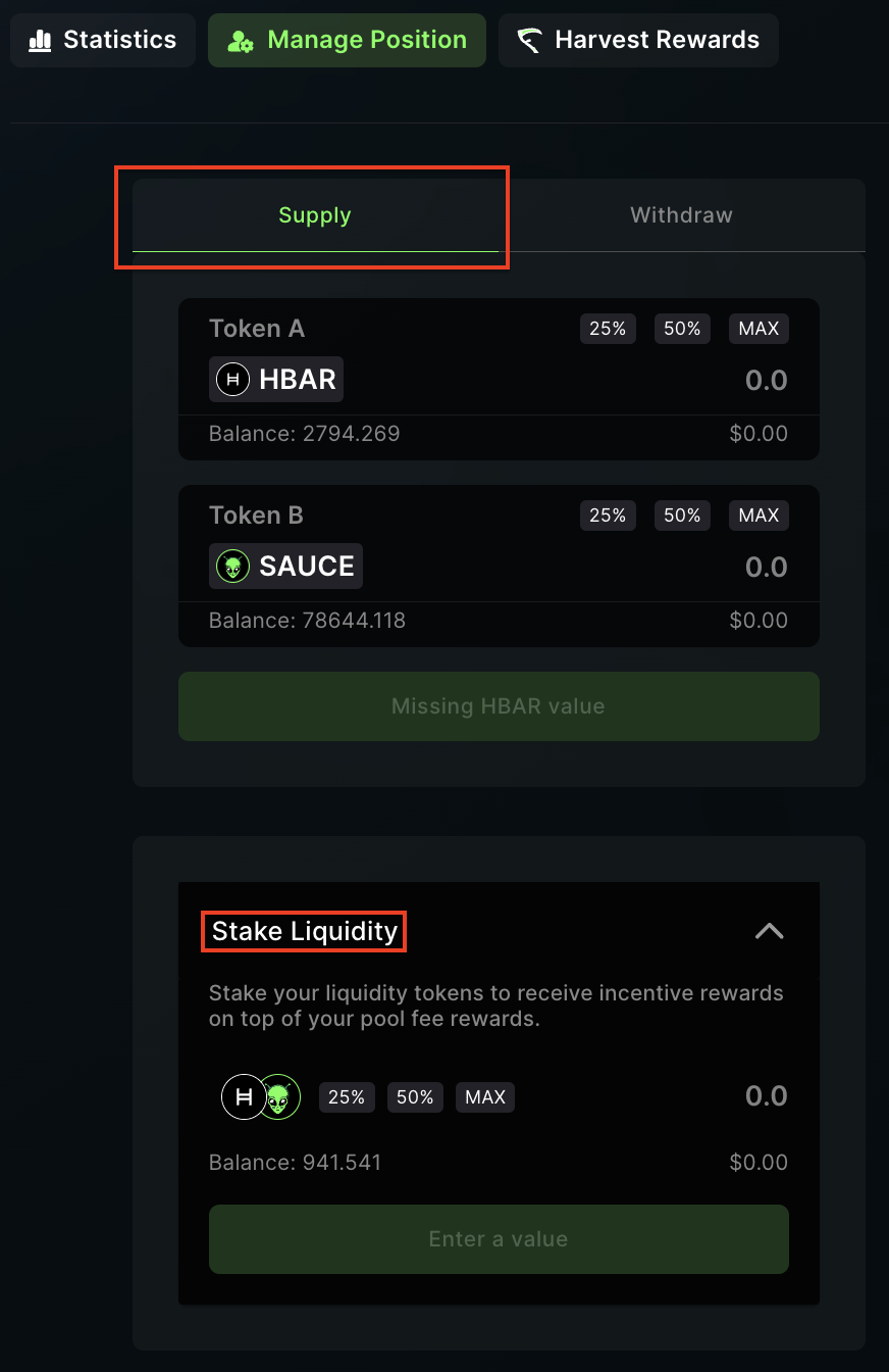 1. Navigate Interface- Inside the “Manage Position” tab, select “Supply” and locate the “Stake Liquidity” section.