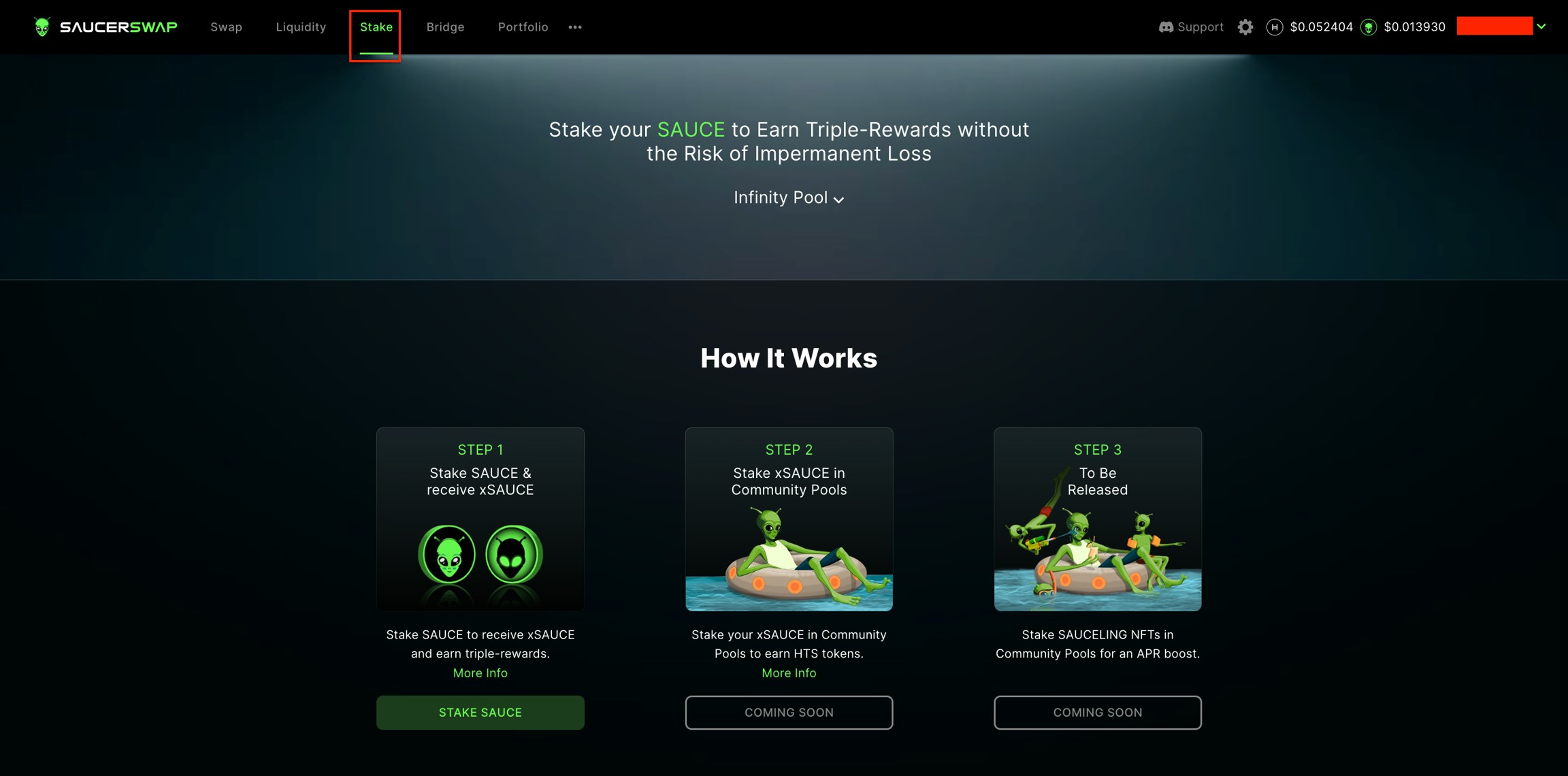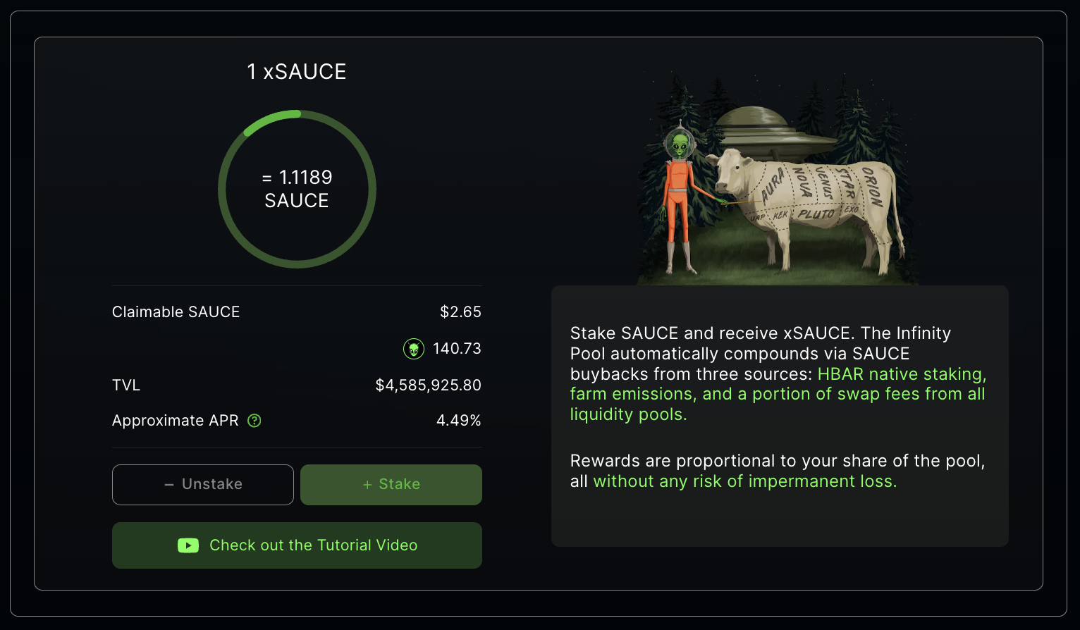 - SAUCE/xSAUCE: The exchange rate between SAUCE in the Infinity Pool and circulating xSAUCE. This rate updates once a day when rewards are sent to the Infinity Pool.