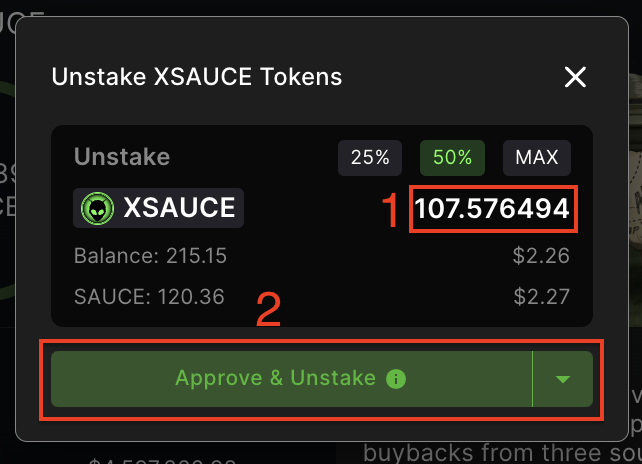- Claimable SAUCE: The SAUCE you can claim if you unstake all your xSAUCE. Calculated by multiplying your xSAUCE by the SAUCE/xSAUCE rate.